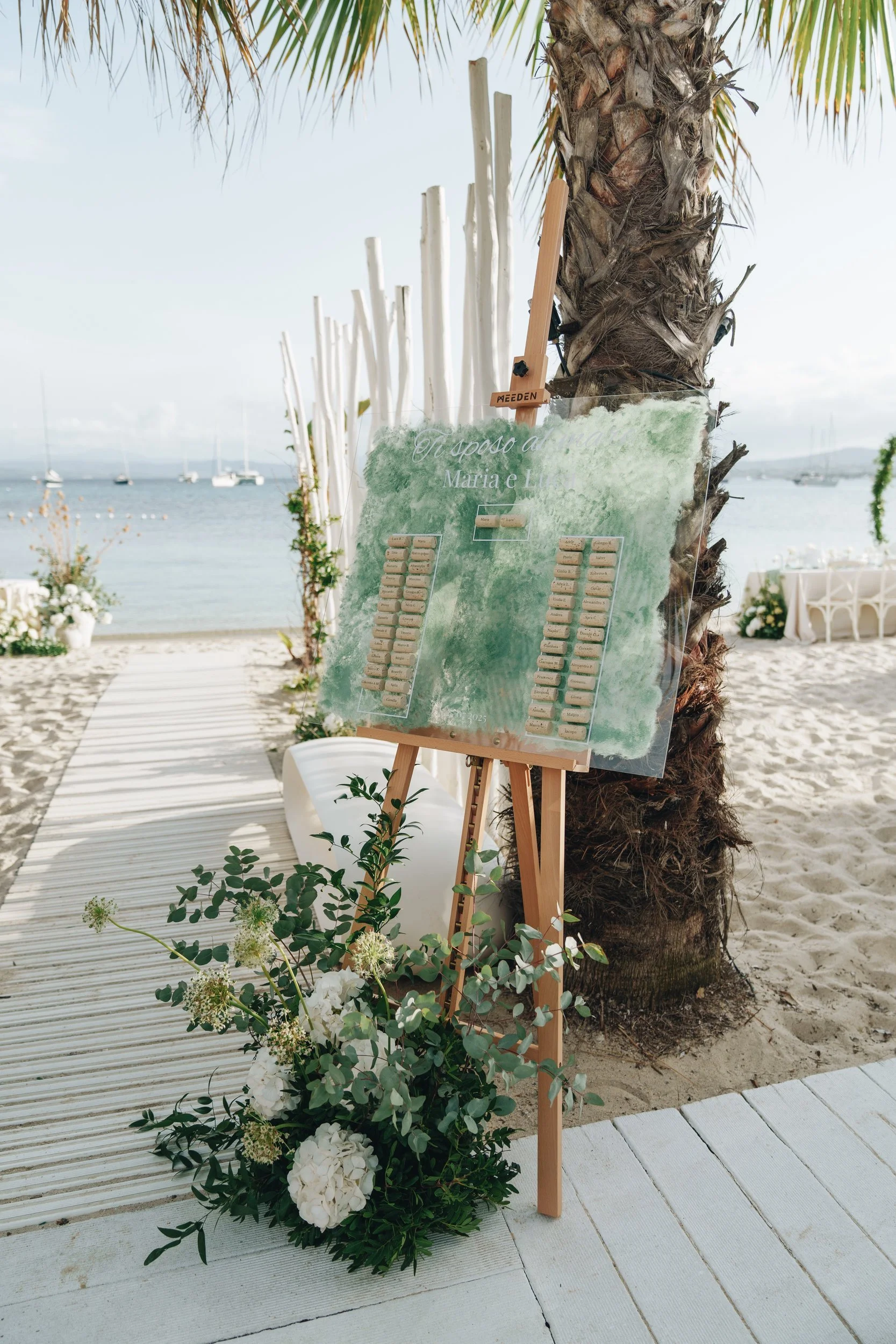 The details reflected the couple's personality: luggage tags as place cards and menus in the shape of continents. A special accent was reserved for the bride and groom's table, whose menu appeared in the shape of Sardinia, sealing the deep bond with the land that hosted their love.